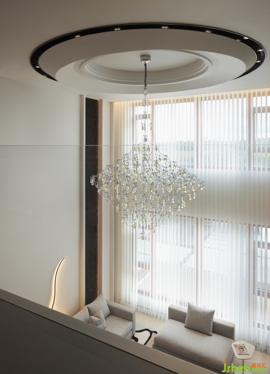 大理石電視墻體后方是別樣天地,水晶藝術雕塑的引領下間隔出擺放藝術品的玻璃展柜區(qū)間,借設計之手,藝術浪漫中透露奢享,以視覺情緒帶動自由舒適的美妙氛圍。