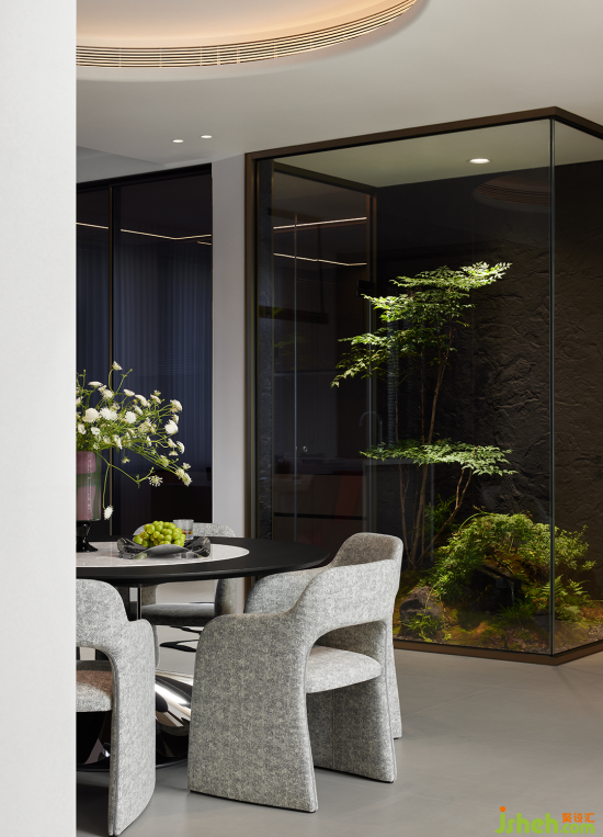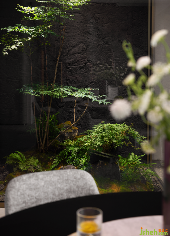設計師將餐廳的位置有意前挪,位于客廳與餐廳空間的中心視角處,家人賓朋可在視線匯聚處舉杯共飲,盡享歡愉時刻。自然的造景角落也是設計師匠心獨運的設計所在,用石塊、土壤和綠植打造的真實夢境,奇幻至妙、生機盎然。