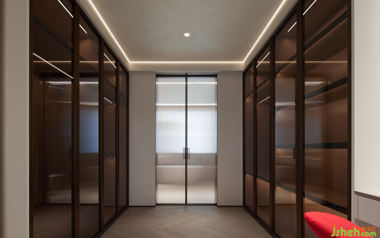 客臥之一以棕褐色調(diào)打造自然溫和的整體氛圍,褐色與紅色點綴在深邃的空間中更顯奢華,巧妙尋得完美的平衡。玻璃門衣柜簡約而不失高雅格調(diào),彰顯出大氣利落的質(zhì)感,秩序之中連接一日起居。