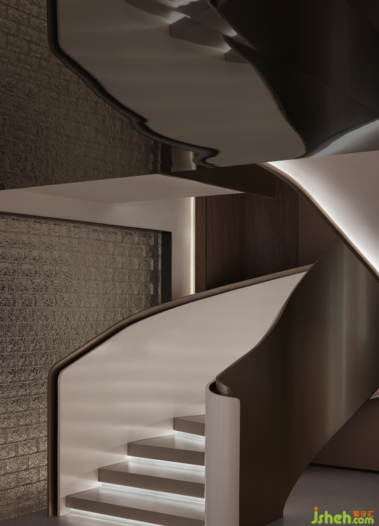承上啟下與起伏轉(zhuǎn)折,樓梯是空間連接的紐帶,在本案中不同層級(jí)的設(shè)計(jì)各有特色,彰顯大宅之美。