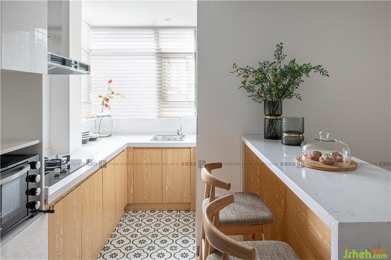 白色與原木色的搭配,餐廚空間干凈明亮,清新自然;復古的黑白花磚別具一格,可愛又有情調,這里不單是烹飪美食,更是烹飪幸福生活。