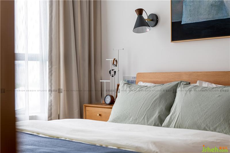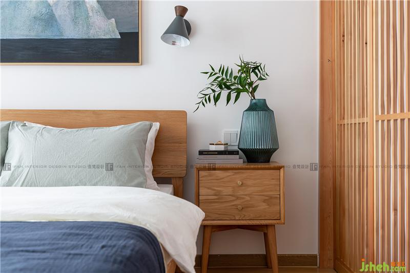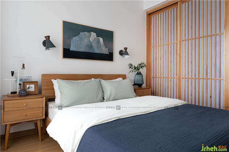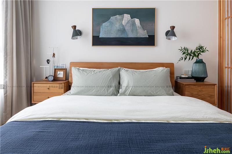 主臥延續(xù)了客廳的裝飾風(fēng)格,室內(nèi)設(shè)計師白色和木色構(gòu)筑出足夠安靜的睡眠空間;深藍色的棉質(zhì)床品,時刻呵護著睡眠健康;簡約利落的線條元素打造極簡美學(xué),如床頭的裝飾畫、柵欄推門、花瓶、床頭的首飾架等。
