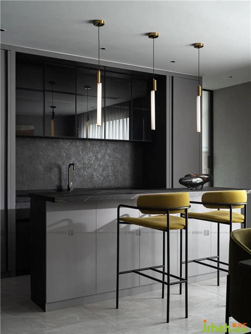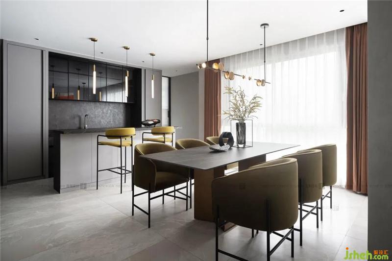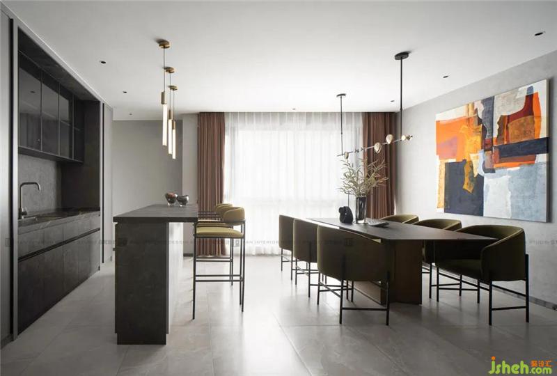 相較于客廳空間的輕柔,用餐空間更偏向低調(diào)奢華,金銅吊燈、絲絨座椅深圳裝修設計、大理石臺面、高級的橄欖綠,恰到好處的精致,營造出低調(diào)溫柔優(yōu)雅的質(zhì)感;