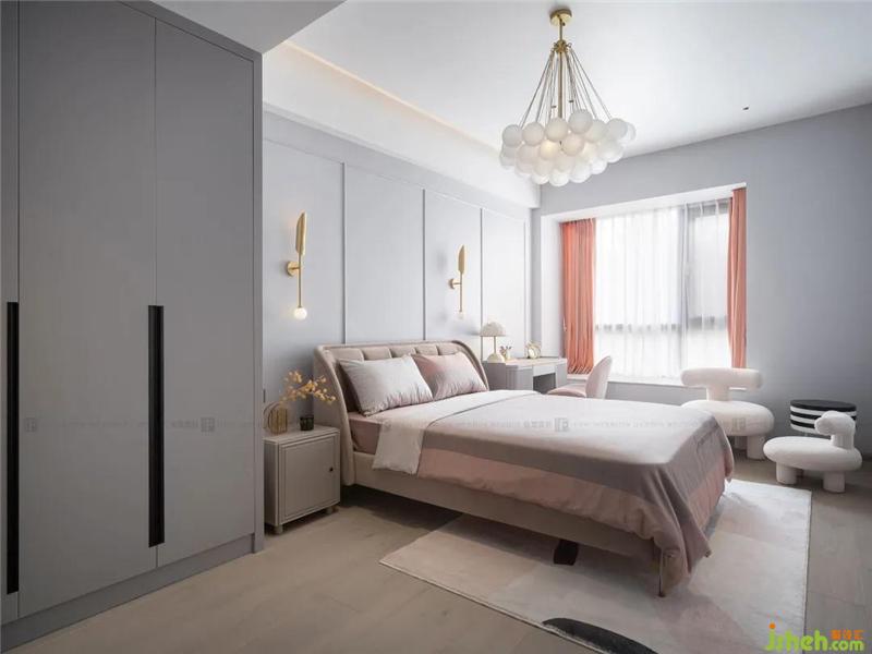 簡單純凈的臥室空間,選用低飽和度的莫蘭迪色系,搭配低調(diào)奢華的金屬深圳裝修設計、絲絨材質(zhì),塑造空間層次、溫柔高級之感,同時給小主人帶來安靜。