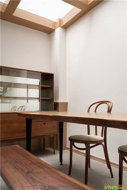 木制餐桌與頂面的木條裝飾相呼應,陽光透過木條與木條之間的距離照射在餐廳里,享受美食的同時也享受著大自然帶來的溫暖。