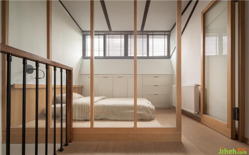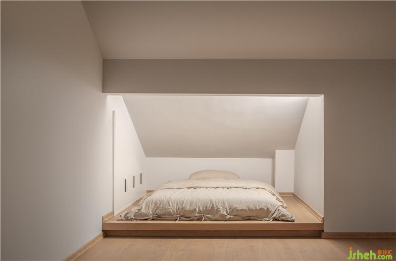 主臥室地面抬高采用地臺上面放置床墊的方式來減少空間壓迫感增加舒適度,合理的利用空間擺放衣柜,有限的空間內最大化的儲存衣物。
