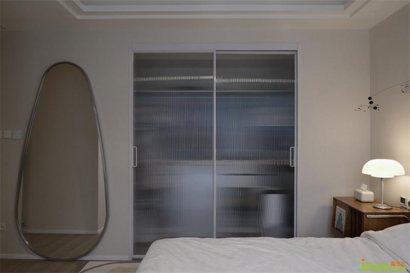 Walk into the bedroom and see wooden beds and low-saturation walls. The sliding glass doors make the things in the dressing room looming.
