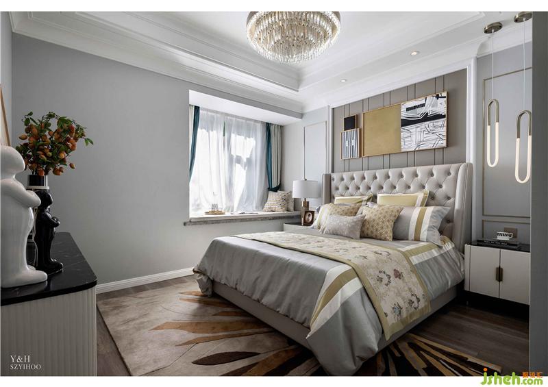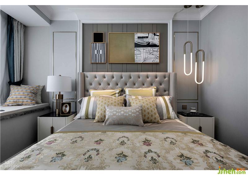 柔和的淺灰色給主臥營(yíng)造了安寧溫馨的氛圍。床頭兩盞獨(dú)特輕奢的吊燈為沉穩(wěn)的空間增添了一絲趣味。