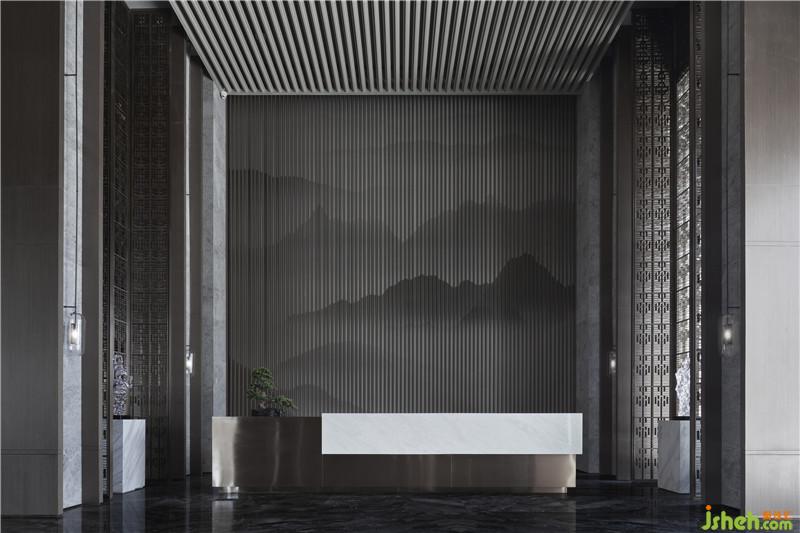 穿過一道半隔斷的屏風,正式步入售樓處,隨著畫卷展開,迎面而來的是空間的開闊感:自上而下、環(huán)繞四周的線條疏密有致、塑造了挺拔大氣的空間感,同時暗示了強烈的秩序性,細密的線條中隱隱呈現(xiàn)出山水畫背景,懸浮著的浮云雕塑,朦朧質(zhì)感,以輕盈之姿,營造雅韻氛圍,使人在進入大廳的瞬間,將周身壓力釋放于外。