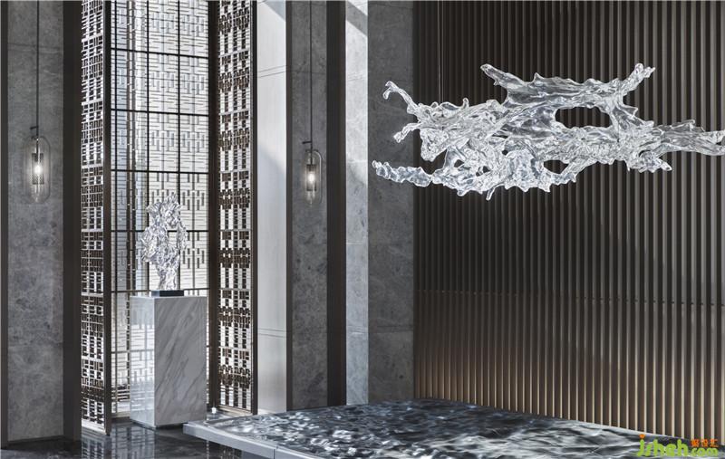 售樓處的入口被掩藏在一片植株與水景交錯的景觀中,踏上一段泉水涌動、山石成景的小路,一側(cè)落地玻璃窗內(nèi)是與外界產(chǎn)生對話的VIP洽談區(qū)——從一開始的門庭空間,訪客便能獲得驚喜的體驗感,“當我們站在橋上,與室內(nèi)隔水相望,感官上就已經(jīng)被快速帶入一個全新的、畫卷般的空間內(nèi)?!盓H DESIGN GROUP易和設(shè)計集團設(shè)計總監(jiān)馬輝把這種感受形容為情緒的醞釀,“室內(nèi)設(shè)計與前廳之間的聯(lián)結(jié),為感官的容器慢慢注入情緒,仿佛踱步于山石園林間?!?/span>