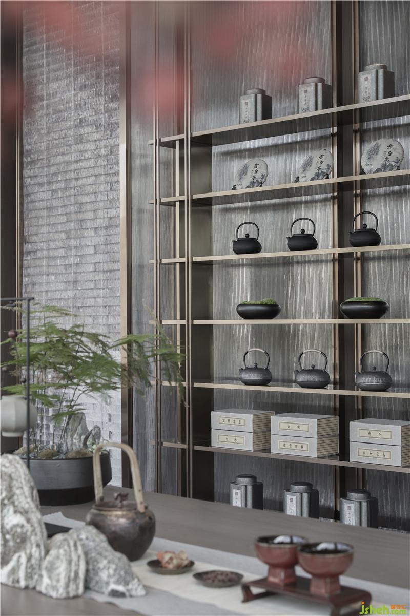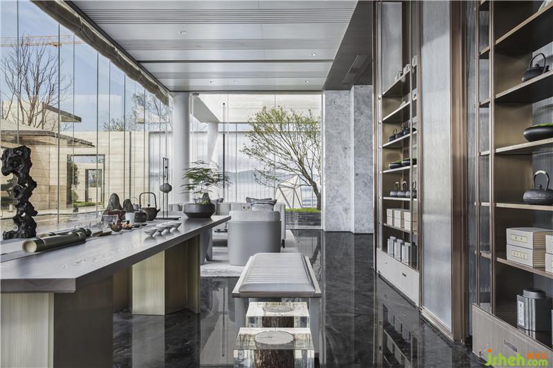 純粹的線條結(jié)構(gòu)在空間內(nèi)全方位地構(gòu)建,頂部的木柵條將自然光引入空間,強(qiáng)調(diào)線條感的燈飾與下方沙盤區(qū)形成呼應(yīng)對立,仿佛連成一體的裝置,暗將藝術(shù)感融入到空間的展示中。東方文化中所特別強(qiáng)調(diào)的“含蓄”被精準(zhǔn)地表現(xiàn)于此,含而不露、不動聲色的力道,既豐盈亦懂得節(jié)制。