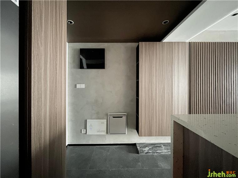 入口鞋柜的側邊做了一排格子展示柜,方便展示主人一些精致的手辦,同時也因為手辦獨有的時尚魅力讓人一進門就有種與眾不同的而感覺,這也是入口的儀式感。