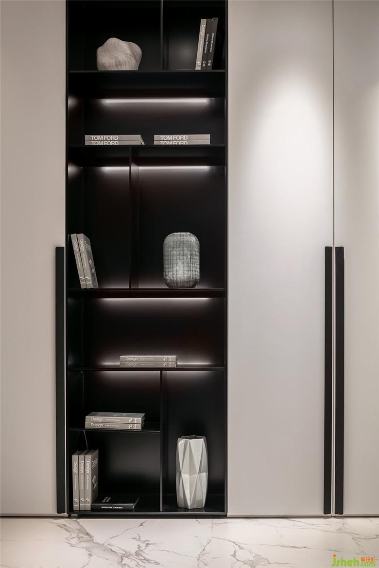 經(jīng)典黑白色的半開(kāi)式裝飾柜設(shè)計(jì)配上冷色系的飾品,在整個(gè)展廳中儼然起到重要的作用,在隔斷和裝點(diǎn)整個(gè)空間之余,也能滿(mǎn)足日常的儲(chǔ)物功能。