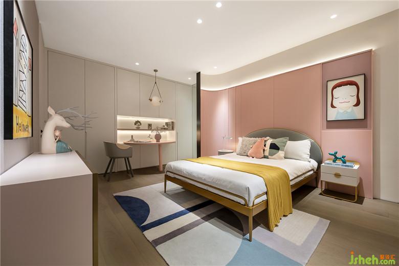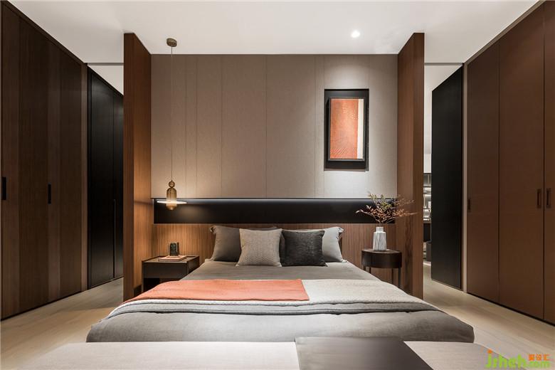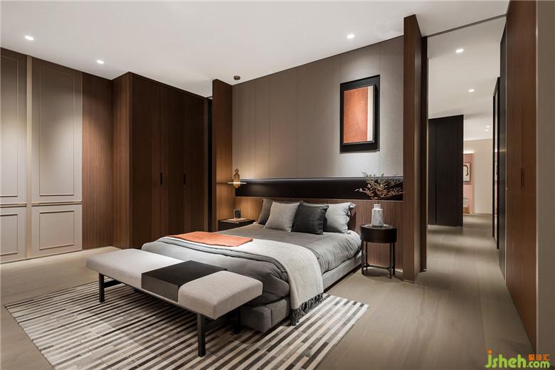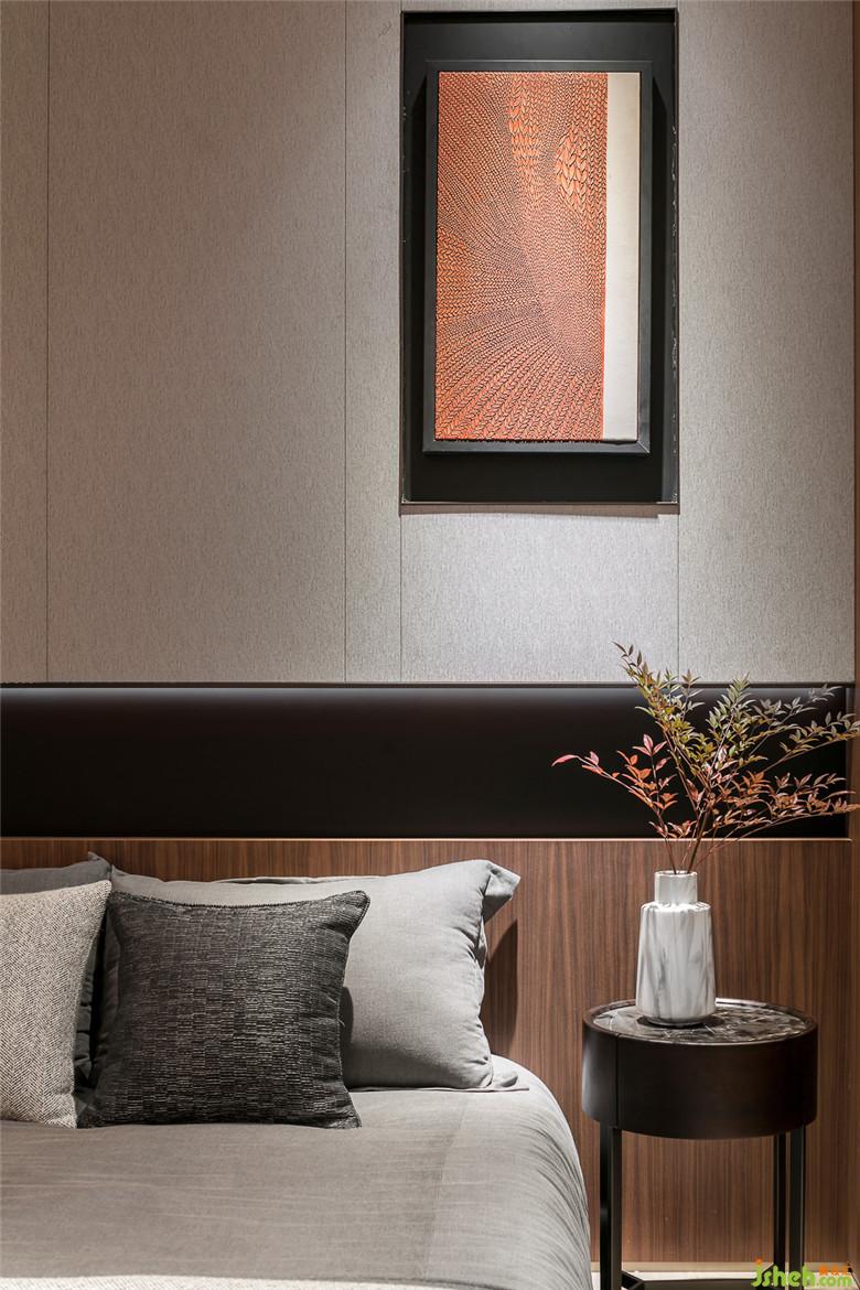 主臥以紅褐色為主色,搭配上灰色系的床品,再點(diǎn)綴同色系的搭巾和插花,整個(gè)房間樸素又不失氣質(zhì),設(shè)計(jì)師可謂心思縝密。