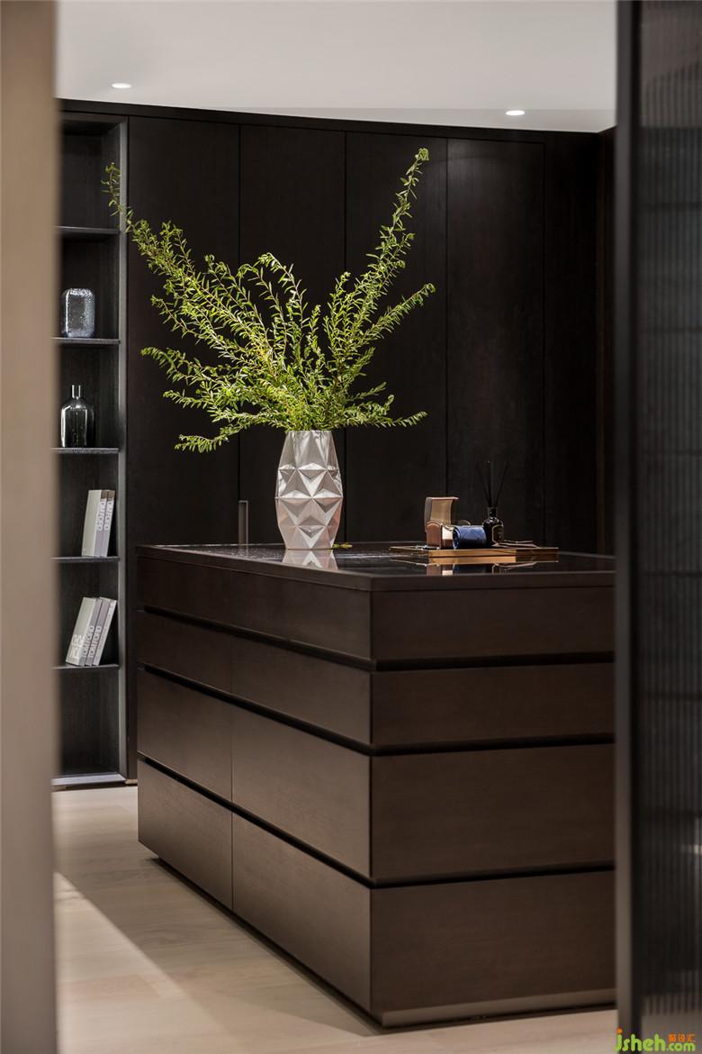 在充滿古典氣息的衣帽間,飾品柜上的錯(cuò)落有致、極具張力的綠枝搭配具有設(shè)計(jì)感的白色器皿,給整個(gè)衣帽間增添了一抹綠意。