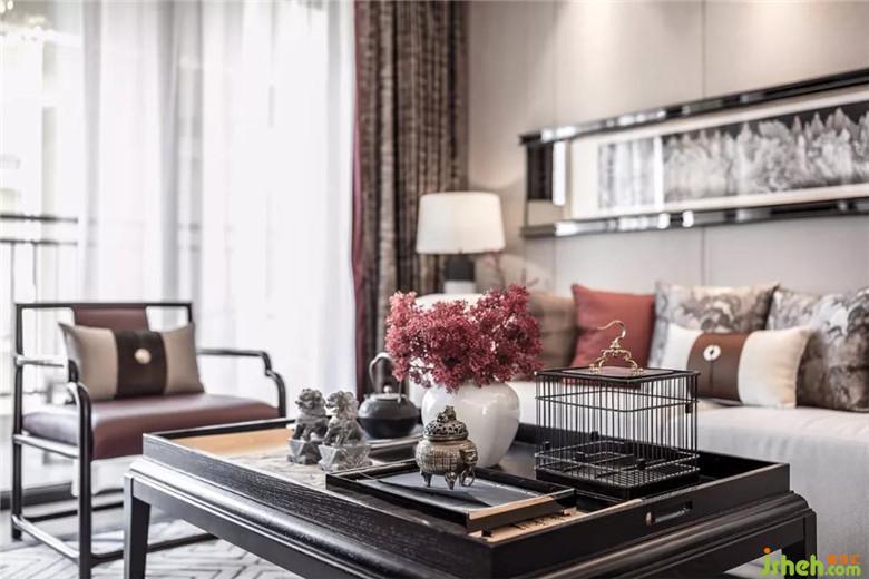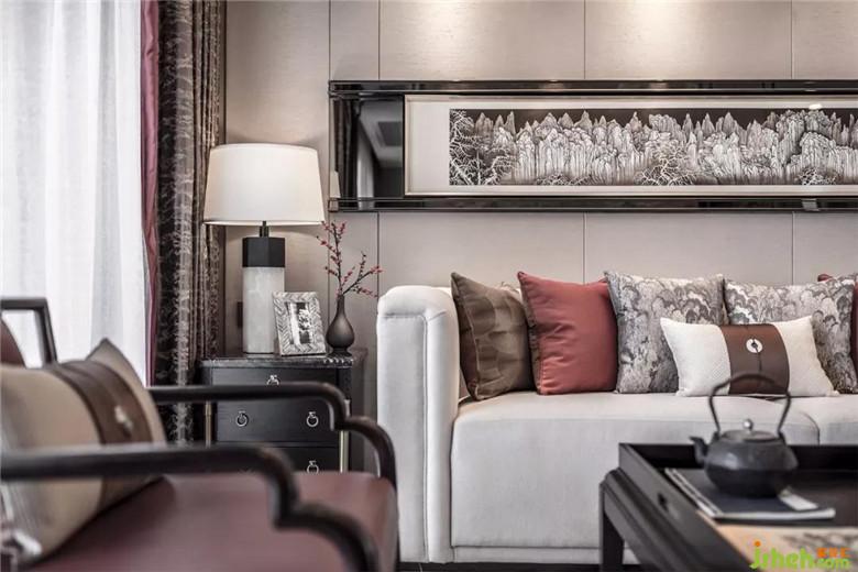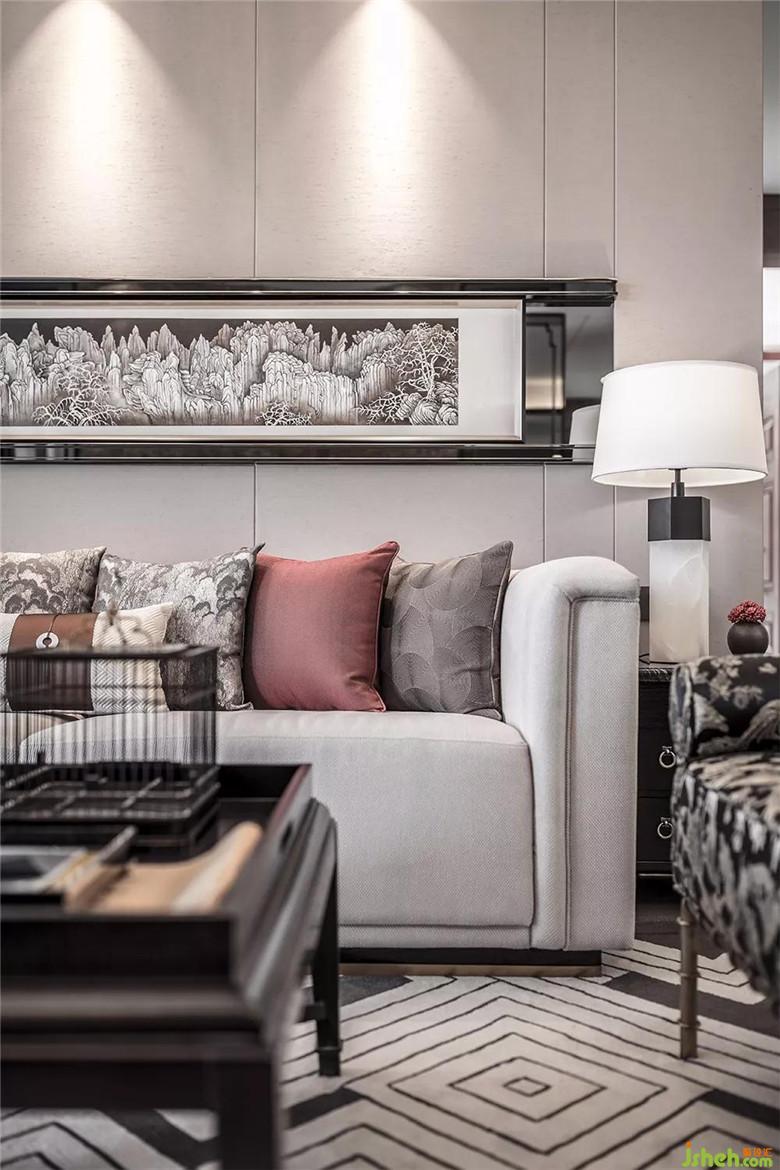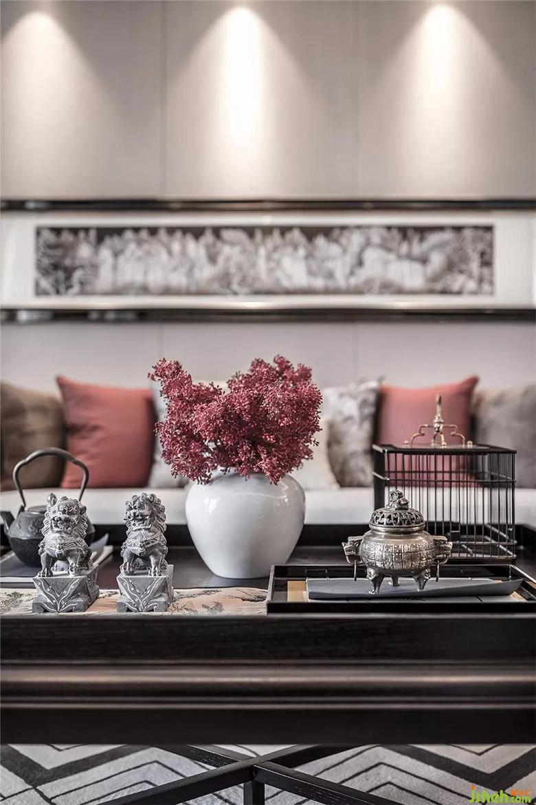 空間中家具面料選材與精裝的材料結合恰到好處,古松和龍等帶有中式元素擺設的點綴,讓整個空間突顯品質感