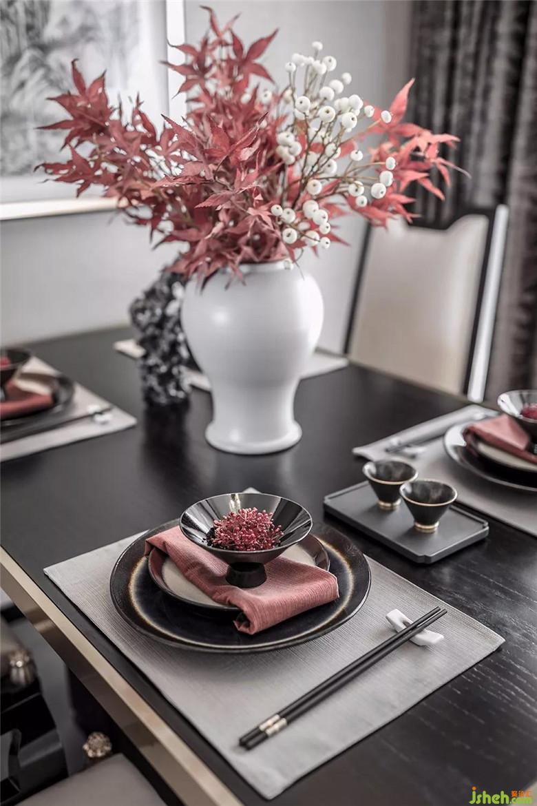 座椅帶有弧度的把手,加上有造型的擺飾,干凈的花器與正紅色的花藝,如初雪中綻放的紅梅,為整個空間增添了一絲柔和與生氣