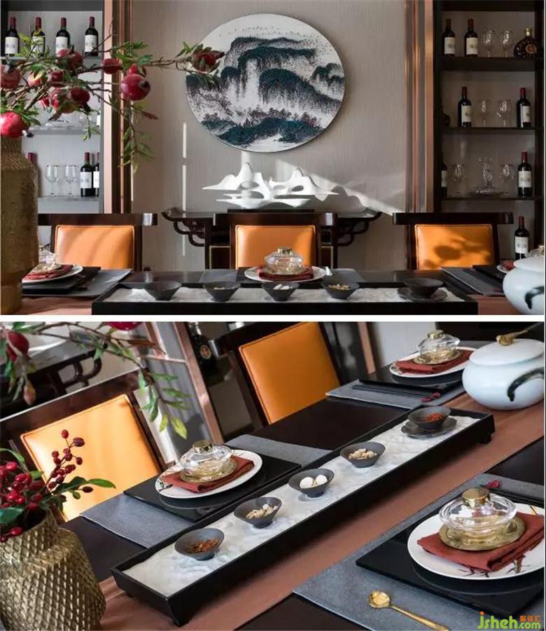 餐廳地面沿用富有水墨肌理感的銀灰色大理石,搭配深色的餐桌及餐椅,紅色的花藝點(diǎn)亮了整個空間,襯上一盞中式藝術(shù)吊燈,使其富有濃郁的東方內(nèi)涵,卻又不失現(xiàn)代都市的生活方式。