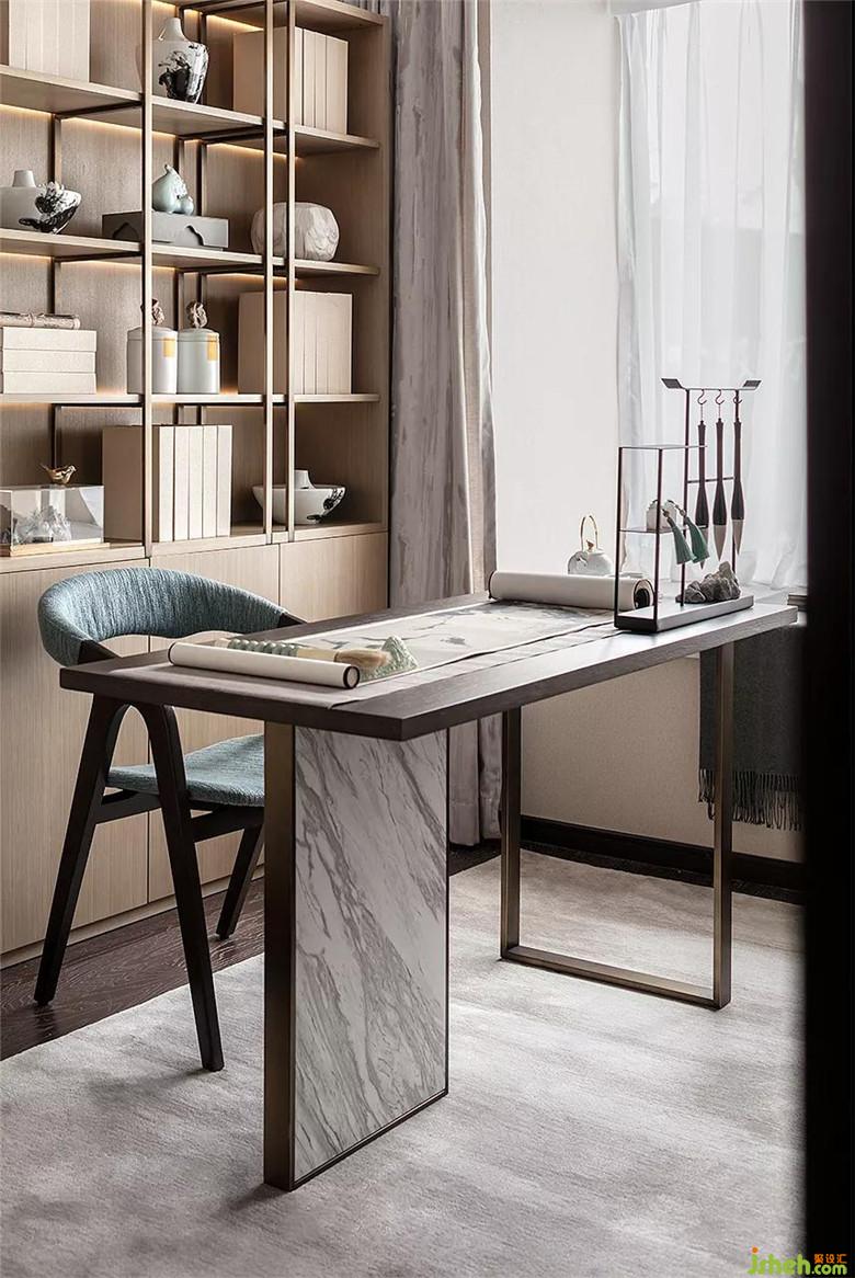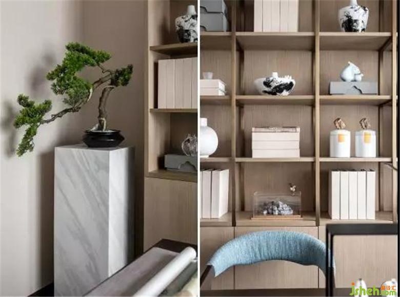 于文墨氣息中,雅致點(diǎn)點(diǎn),韻味濃濃。書(shū)案與文房四寶加以淺色調(diào)書(shū)架上的卷帙與器物營(yíng)造出藝術(shù)文化氛圍。