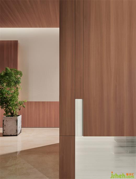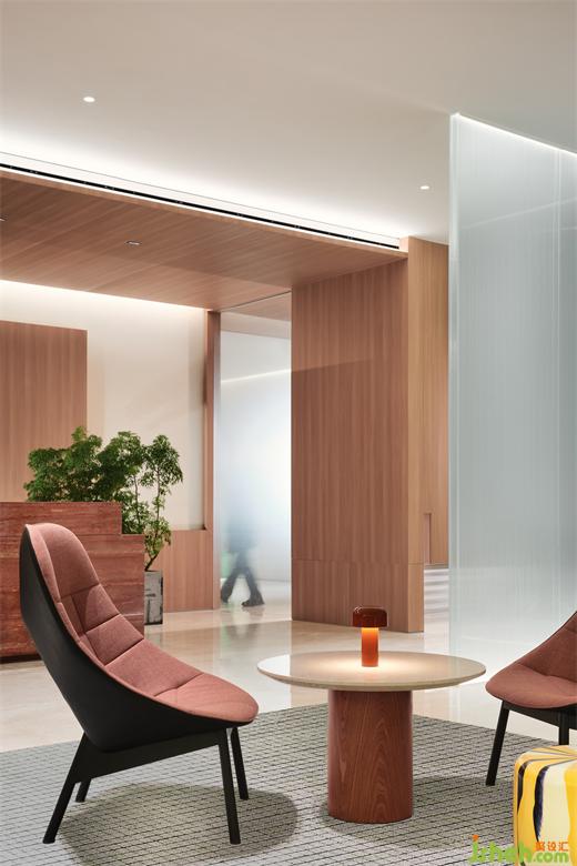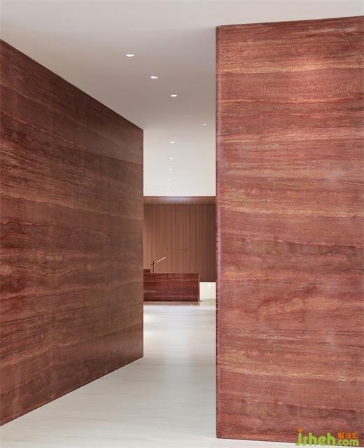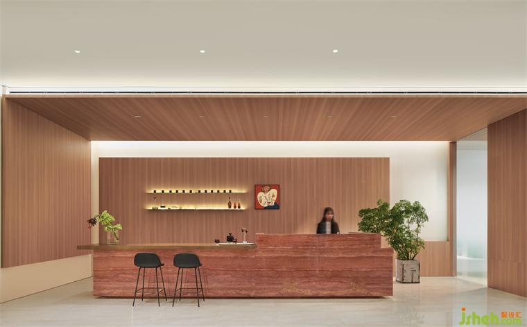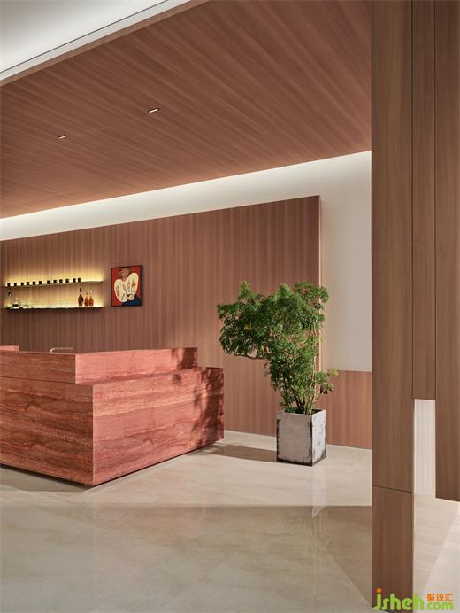 從門頭開始,用通體的紅洞石搭建感官支點,在造型上作內倒、折疊處理,制造視線與動線的轉折,長道盡頭窺見前臺的“半身”,欲言而止且露高級。