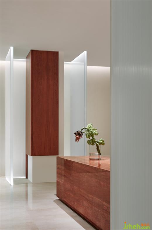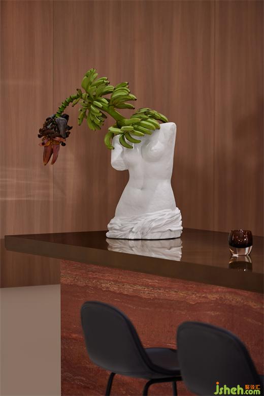 原始空間的結(jié)構(gòu)立柱占據(jù)公區(qū)一側(cè),與其弱化,不如讓其成為天然的置景與置物架構(gòu)。并非為捏造而設(shè)計,解構(gòu)形體之上裝綴材質(zhì),保留內(nèi)部空間的通透而不失豐富的層次,同時讓單純的結(jié)構(gòu)生長出實用性。