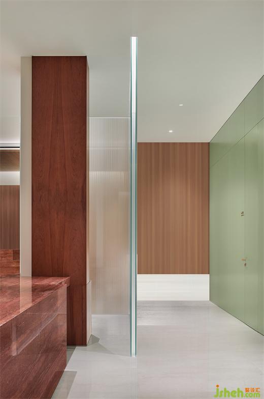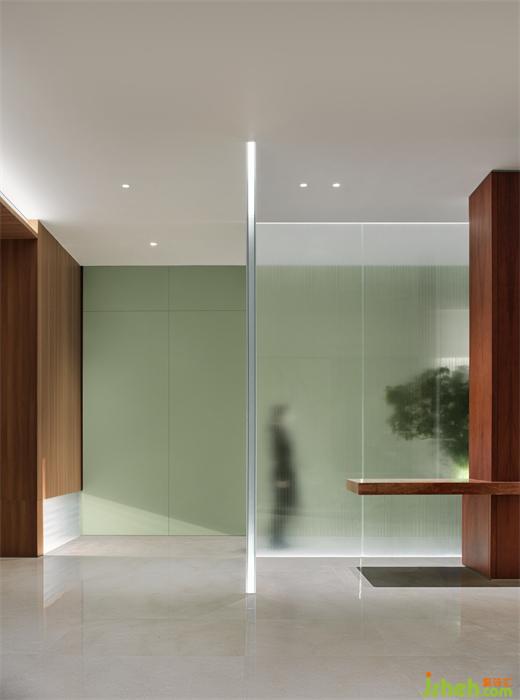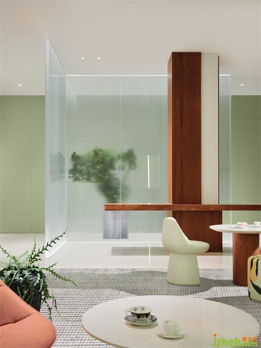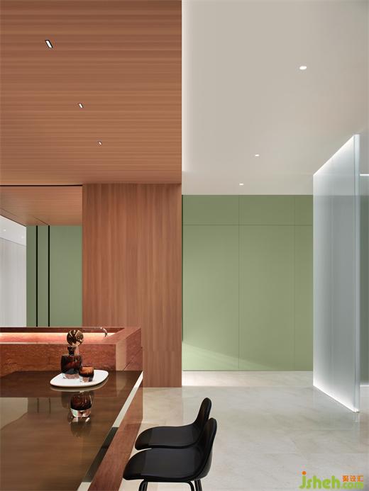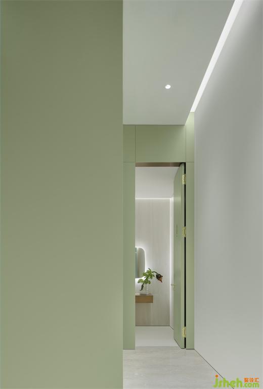 起伏流動的公區(qū),與之相對的是一整片綿延的薄荷綠墻,輕薄地劃出開放與私密邊界,門室隱入墻面,愈喚起向內(nèi)探索的興趣。