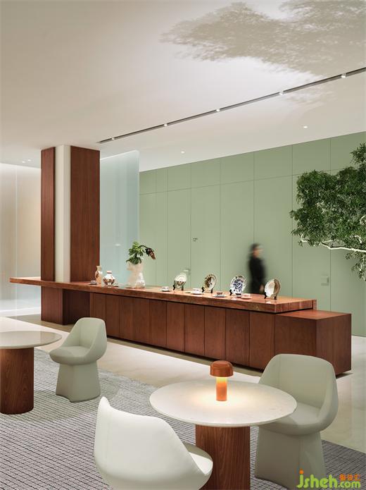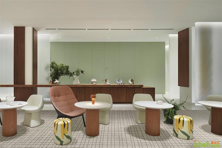 會員中心設(shè)計將單側(cè)柱體垂直倒置,通過咬接與錯位,順勢衍生出展示臺面,使獨立間隔的體塊合為完整的功能區(qū)域,盛放多樣化圈層場景,器物特展、茶點賞味、花藝品香,以開放的姿態(tài)靜候貴客的沉浸體驗。
