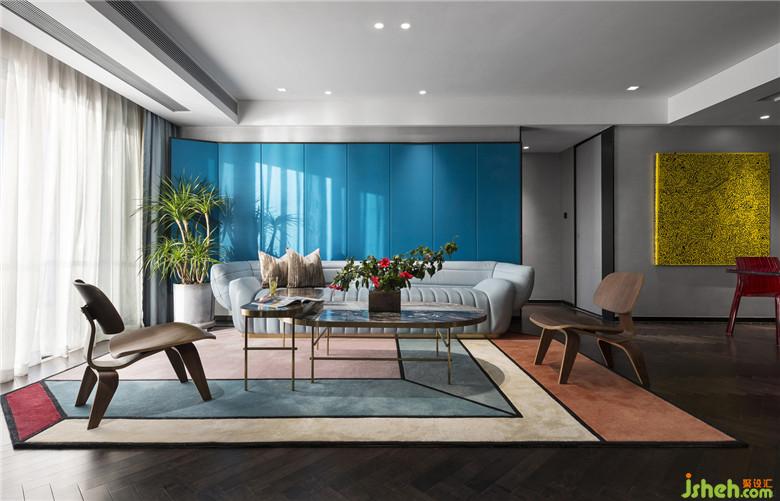 客廳看起來(lái)大氣時(shí)尚,藍(lán)色的背景墻盡顯活力,簡(jiǎn)約的桌子,室內(nèi)設(shè)計(jì)師搭配兩張?zhí)厣囊巫?,再加上有風(fēng)格的地毯,整個(gè)空間微妙微翹的舒適