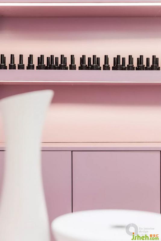 在功能布局上,我們采用了公共區(qū)域完全開放式的設(shè)計(jì),接待、等候、洽淡、美甲都在一個(gè)區(qū)域,因?yàn)槭且粋€(gè)長條形的格局,如果每個(gè)功能都分開,空間利用會(huì)特別浪費(fèi),另外我們也是希望通過這種方式來嘗試讓空間有一種不同的經(jīng)營方式。