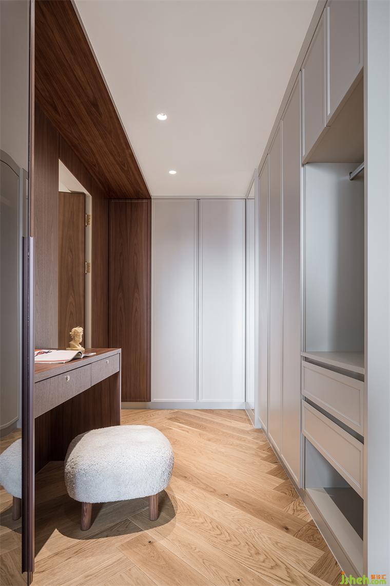 主臥衣帽間圍繞門(mén)和梳妝臺(tái)做了一體化木質(zhì)框景設(shè)計(jì),柜體,滿(mǎn)足了強(qiáng)收納需求,整體規(guī)整統(tǒng)一,收納空間足。
