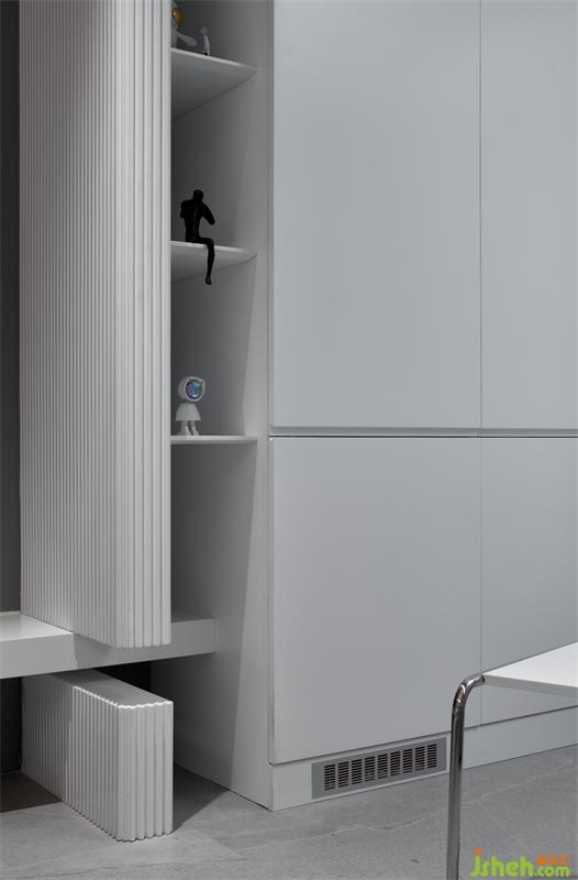 開放格展示藝術(shù)品,不僅沒有破壞整體協(xié)調(diào)感,使得空間輕微分離卻緊緊相依,客廳的家具顏色在選擇上保持統(tǒng)一,顯得空間尤為整潔。