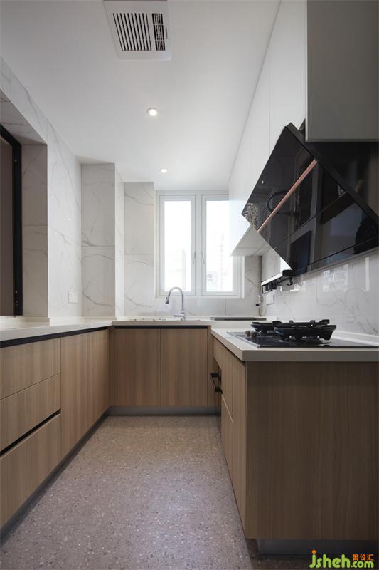 U型廚房兼顧美觀與收納,木質(zhì)的廚柜為廚房空間增添一絲美麗又大自然的舒適感。