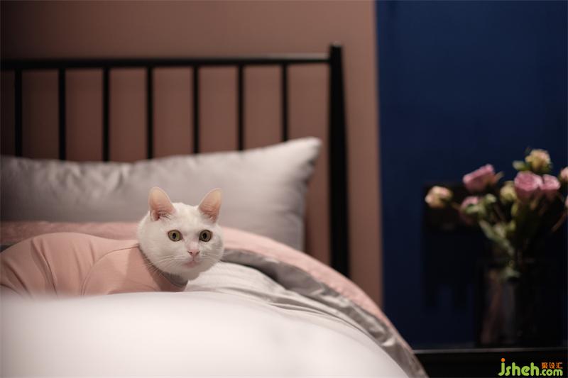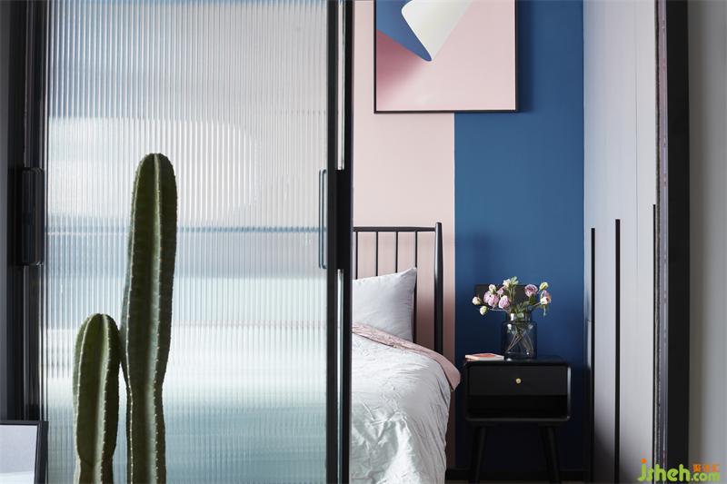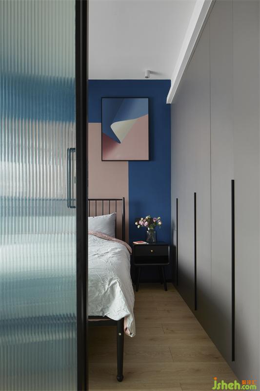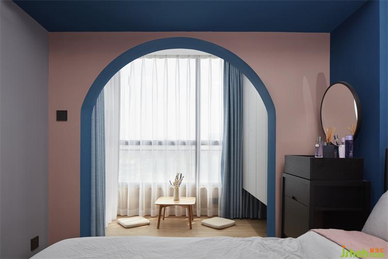 拱形元素用臟粉與藍(lán)色穿插,顯得這個(gè)衣帽間猶為儀式感,不落地的衣柜輕盈些許,去除繁雜,坐在窗邊享受這陽光灑落的感覺