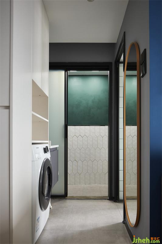 二次干濕分離洗手臺與家政洗衣區(qū)結(jié)合,完美解救陽臺區(qū)域給廚房,水泥灰的墻地磚與定制灰色洗手臺盆極簡與干凈