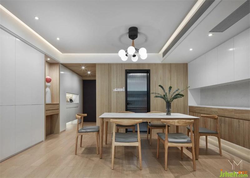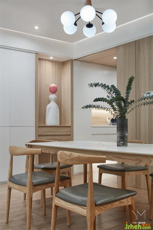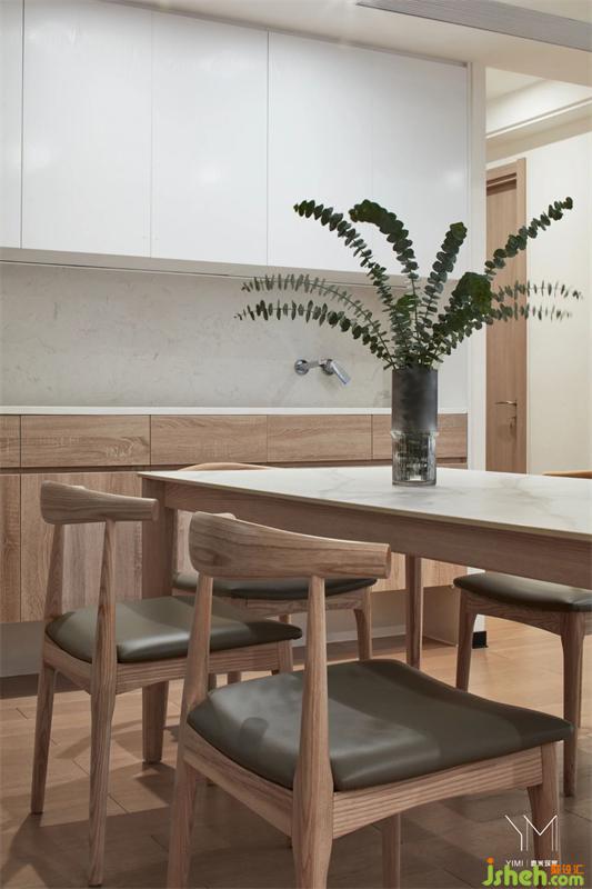 家具采用質(zhì)感平滑的天然材質(zhì),營造清新、干凈的家居氛圍,沒有多余的色彩,原木餐椅彰顯自然情懷,將餐廳簡約利落特性表達到位。