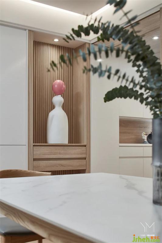 餐廳望向玄關(guān),木格柵串聯(lián)空間,傳遞著次序美感。
