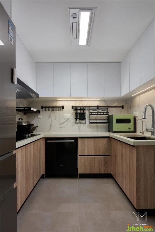 廚房柜門采用暗拉手形式,擁有豐富的儲物空間,簡單木色和白色搭配,打造清爽的煙火一角。