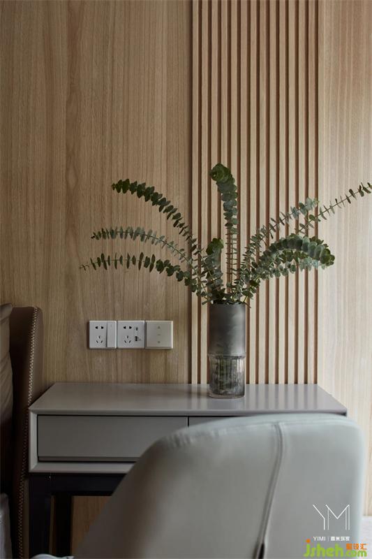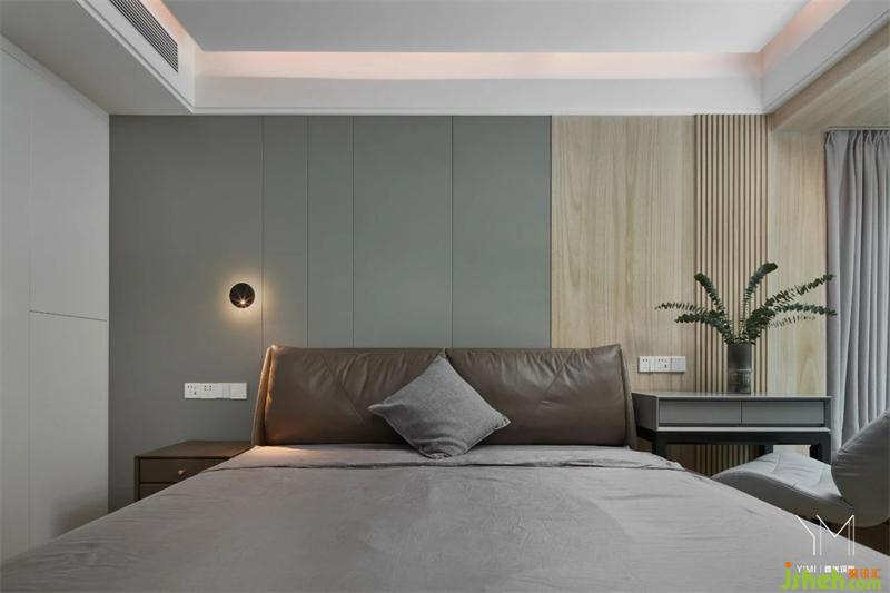原木與高級(jí)灰調(diào)床頭背景相結(jié)合,為原本單調(diào)的室內(nèi)空間增添了一抹自然的顏色,簡(jiǎn)約不失高級(jí),在這個(gè)空間中相互制約,讓視覺(jué)達(dá)到完美平衡。