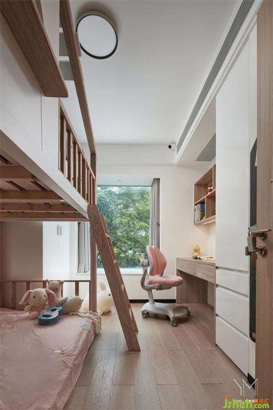 兒童房上下床裝修設(shè)計(jì),墻面一體化的衣櫥滿(mǎn)足兩個(gè)小孩的儲(chǔ)物需求,開(kāi)放格設(shè)計(jì),給予孩子更多的閱讀空間,利用空白墻體打造繪畫(huà)區(qū),提升孩子的學(xué)習(xí)能力,也激活了整體的童趣。