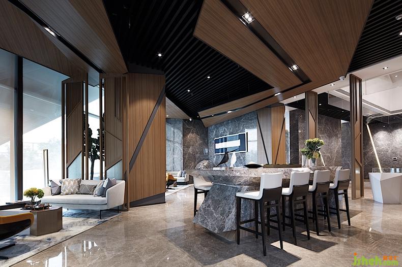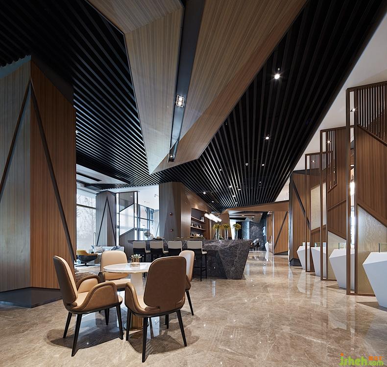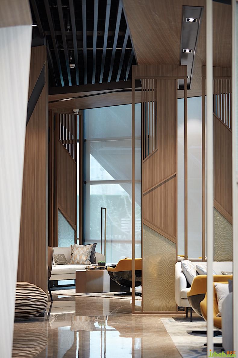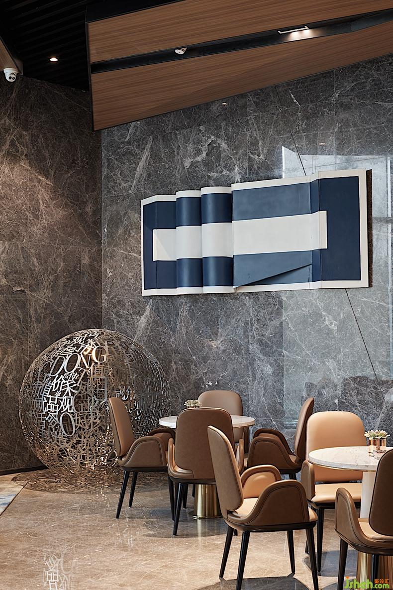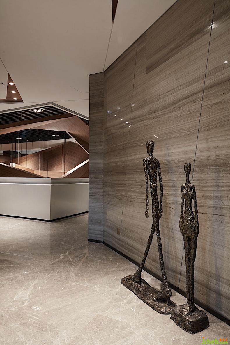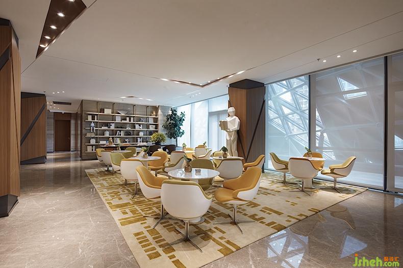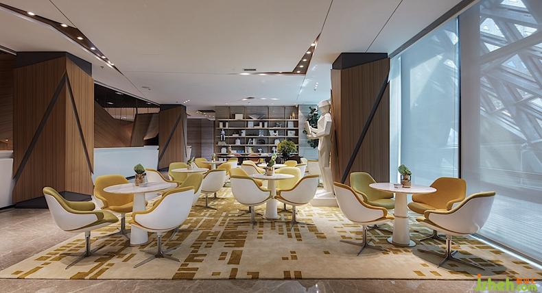 二層綜合洽談區(qū)用明亮的鵝黃色來(lái)劃分,地毯幾何形狀的紋路與整個(gè)空間的線條呼應(yīng),矗立在旁的雕塑為空間增添了色彩。設(shè)計(jì)公司