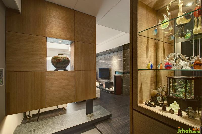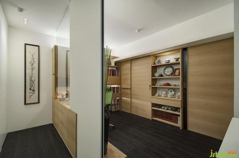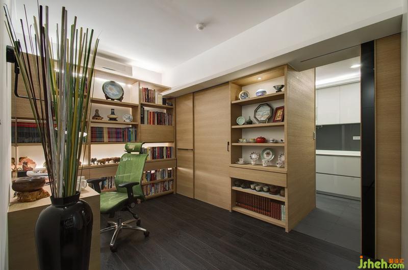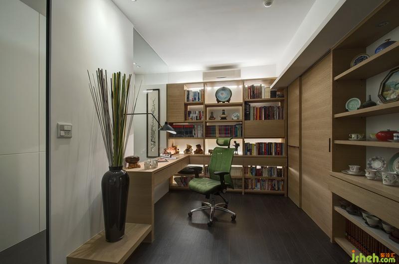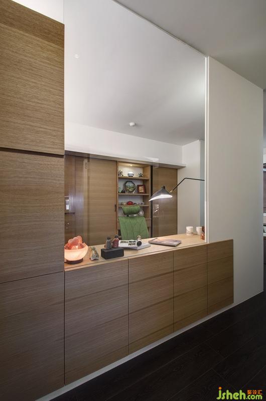 書房主墻以一道實(shí)木書柜墻透過縱橫線條為廳區(qū)編織出視覺端景,佐以大面積鋼刷實(shí)木紋路裝飾墻,為整座立面帶出多樣表情。
