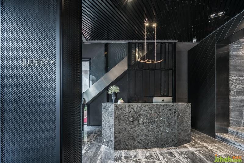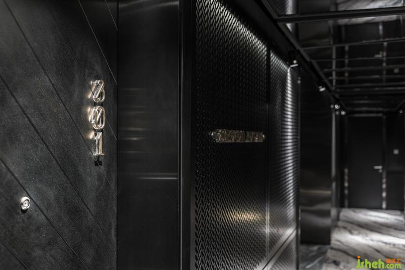 「月汐」的區(qū)域包含入口、接待廳、電梯間、二樓客房走廊,引導(dǎo)旅客前往夜間休息的場(chǎng)所。入口處以海鹽腐蝕的銹板為視覺(jué)的焦點(diǎn),呈現(xiàn)出時(shí)間和水同樣稍縱即逝的獨(dú)特氛圍。紋面大理巖搭配穿透感的金屬網(wǎng)板從一樓接待廳延伸至電梯間與客房走廊,形成室內(nèi)主要的視覺(jué)結(jié)構(gòu)。客房的走廊細(xì)窄而狹長(zhǎng),燈光穿透萬(wàn)以千計(jì)的鏤空墻面,將影子投射在孔洞的深處,仿佛走在廊道,就像進(jìn)行一場(chǎng)潛心的修行。