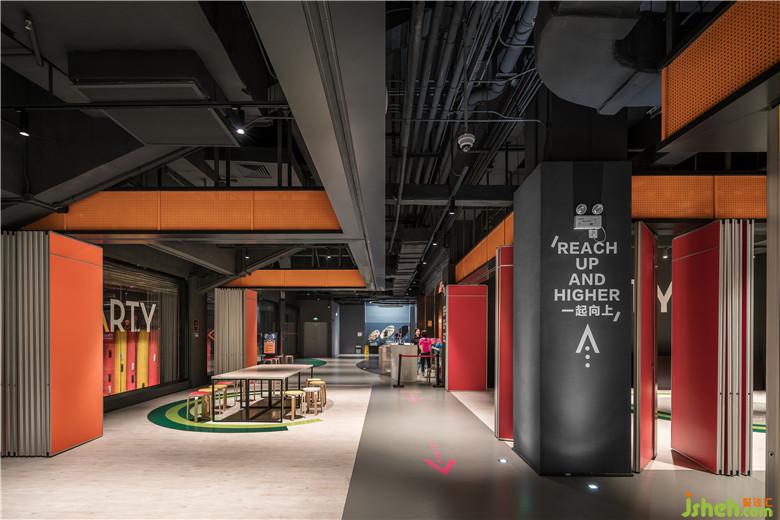 門(mén)口區(qū)域的設(shè)計(jì)同樣以山陵形狀延伸,室內(nèi)設(shè)計(jì)師以利落線條呈現(xiàn)山陵,并增加澳洲元素體現(xiàn)品牌形象,使用與party room相同的橙色沖孔板作為主要材質(zhì),融入品牌色與輕工業(yè)元素,整體打造更鮮明的品牌形象,重塑品牌價(jià)值。