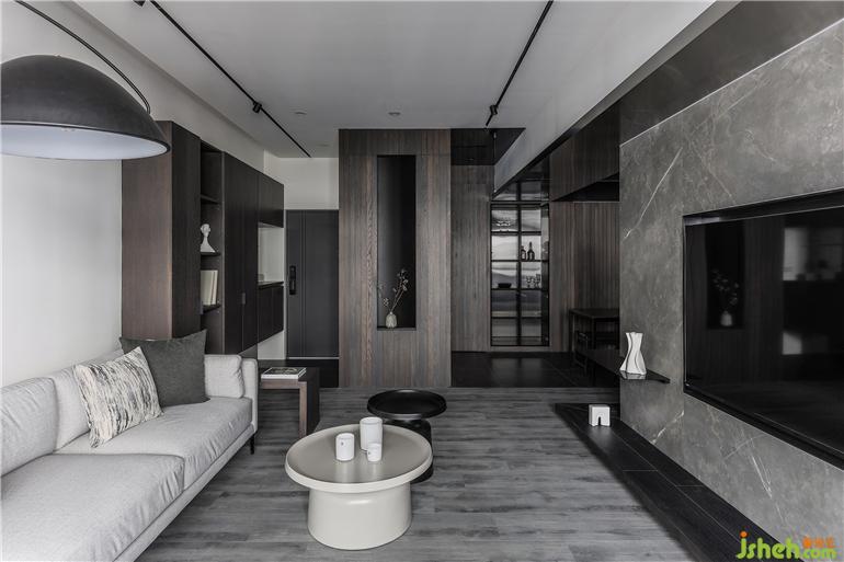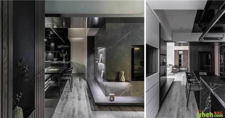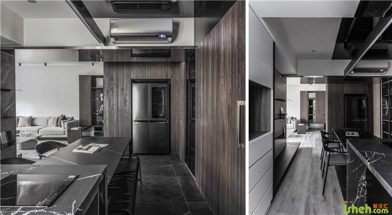 材質(zhì): 意大利大版磁磚,橡木實(shí)木皮染灰,耐磨海島型地板,毛絲面不銹鋼、灰鏡、火山巖、黑砂黑鐵件
