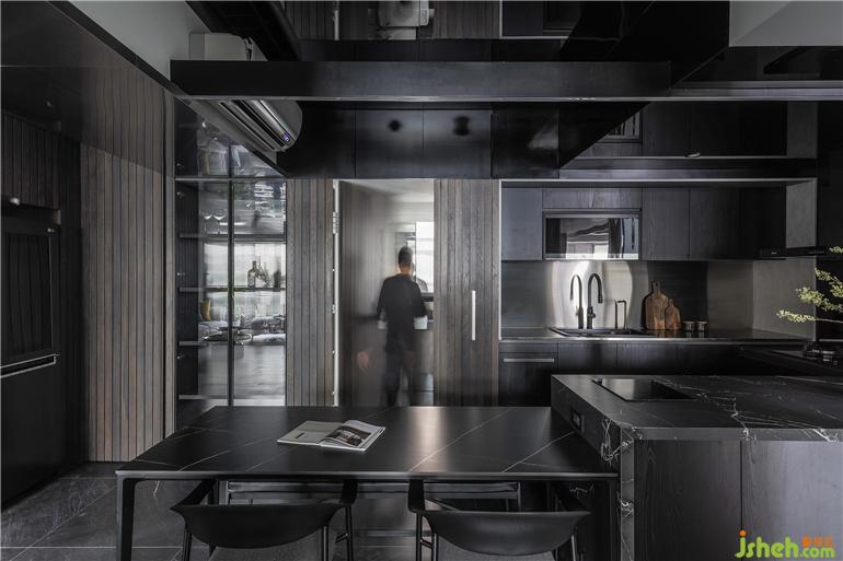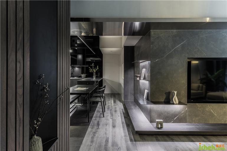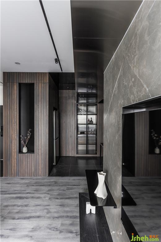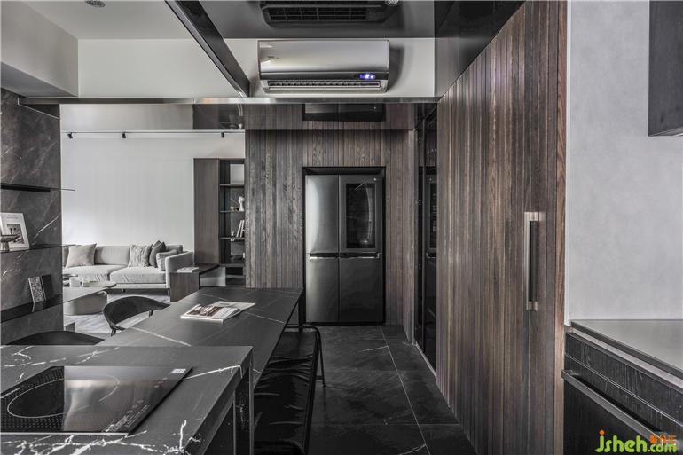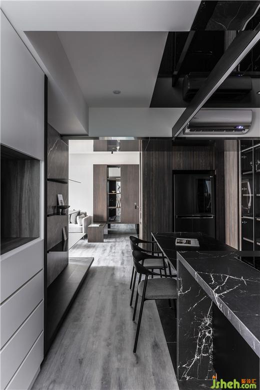 餐廳的氛圍獨(dú)特,運(yùn)用異材質(zhì)本身的低彩度與肌理,鋪陳出沉穩(wěn)內(nèi)斂的質(zhì)地之美。墻面與柜體挑選不同深淺的實(shí)木,中島與用餐區(qū)混搭了多種紋樣的石材,一抹霧化的金屬光澤適度的引入,材質(zhì)共融的形式跳脫了呆板的框架,緩和深色空間的沉重感。天花的黑鏡延伸了場域的尺度,倒映著料理時的專注神情,以及共餐時的談笑細(xì)語,生活的想象原來是如此的立體有溫度。