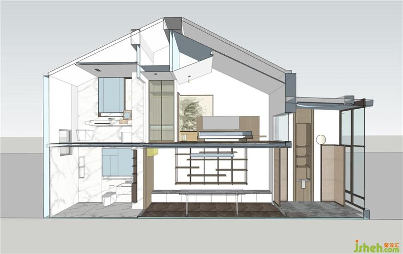 本案作為度假休憩的居所,營造舒適悠閑的居家氛圍為設(shè)計的核心。房子建筑面積90平,層高6米,坡屋頂結(jié)構(gòu)。設(shè)計師充分利用其充足的層高空間,增加夾層,做成上下兩層的loft空間,使用面積擴(kuò)展到將近120平。室內(nèi)設(shè)計師