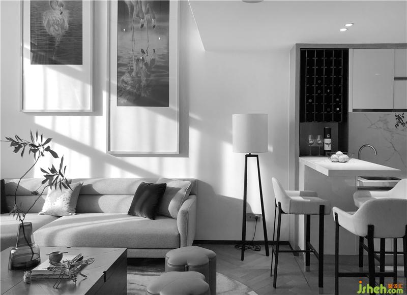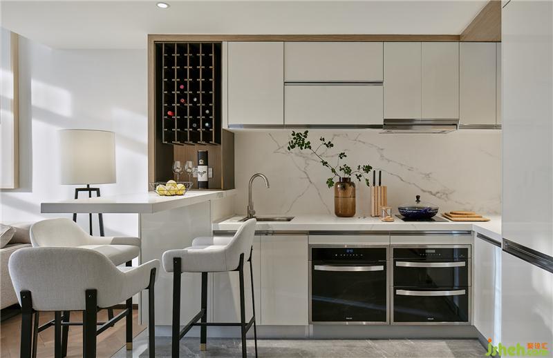 進(jìn)門走道右側(cè)為開放式廚房,白色啞光肌理巖板的運(yùn)用使廚房空間顯現(xiàn)出簡潔、干凈的氣質(zhì)。餐吧臺同樣采用白色巖板作面,隱約見淡墨紋理浮于此中,似云煙,如遠(yuǎn)岫,平添了幾分詩意。鋼和木交織而成的黑色酒架,給質(zhì)感輕盈的白色空間增添了一絲沉穩(wěn)的優(yōu)雅。