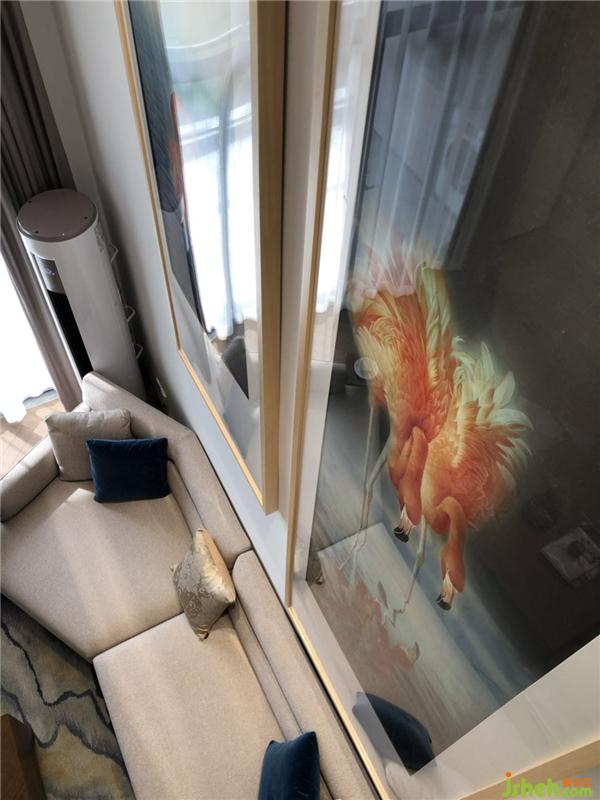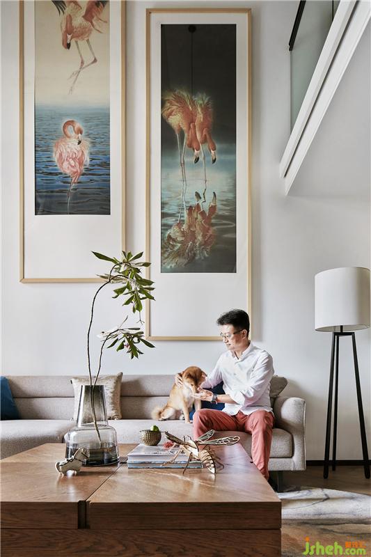 客廳設(shè)計延續(xù)簡練、純凈的風(fēng)格,墻面以藝術(shù)家趙芳巨幅火烈鳥原作《云中歌》裝點(diǎn),折射出主人熱情自由的生活態(tài)度和高雅的藝術(shù)情趣。