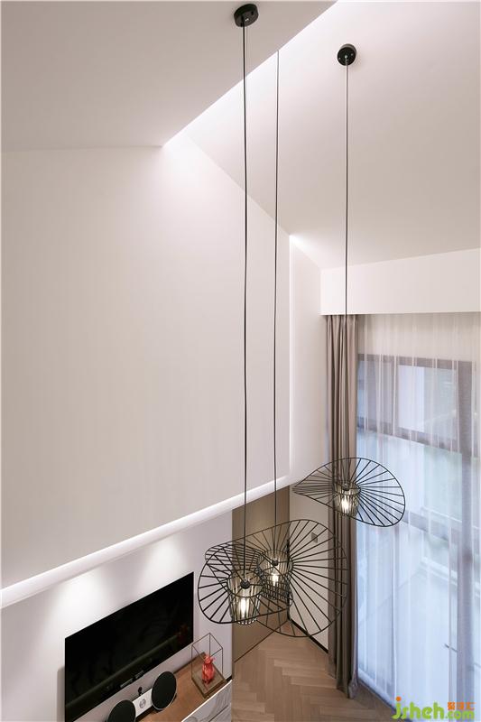 高挑空設(shè)計的客廳,以充足的垂直空間感,營造出先抑后揚(yáng)的空間氛圍。高空輕盈垂落的藝術(shù)吊燈又強(qiáng)調(diào)了中庭挑高的縱向視覺效果,天花與墻面凹凸的純白造型達(dá)到了燈光與形體自然融合。室內(nèi)設(shè)計師