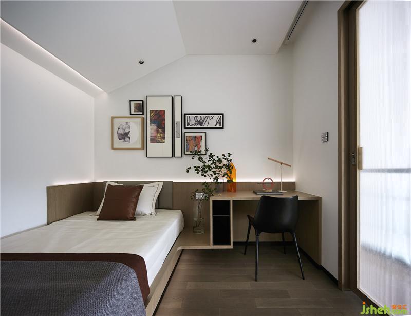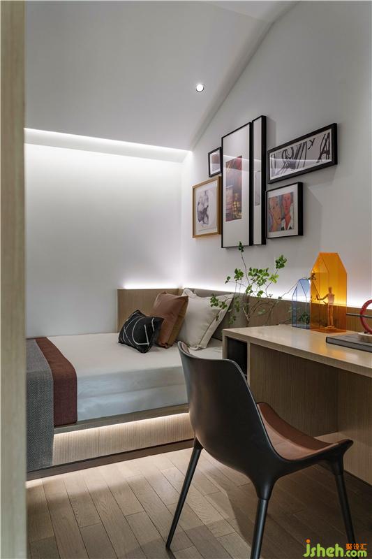 次臥為男孩房,床體造型與書桌采用一體化手法打造,有效節(jié)省了空間。墻面以掛畫及藝術(shù)品等多種元素打造一個充滿藝術(shù)感與現(xiàn)代感的空間。